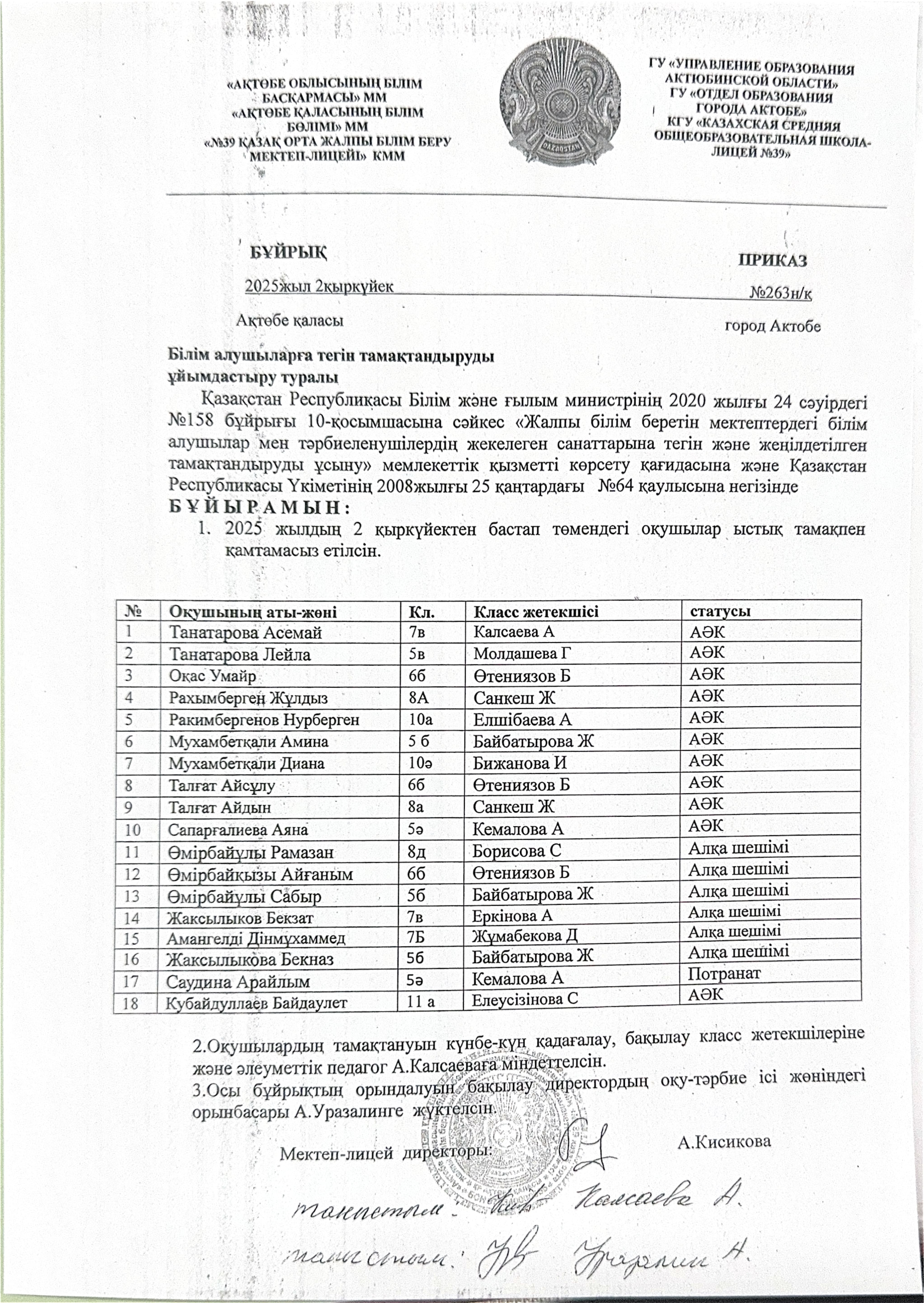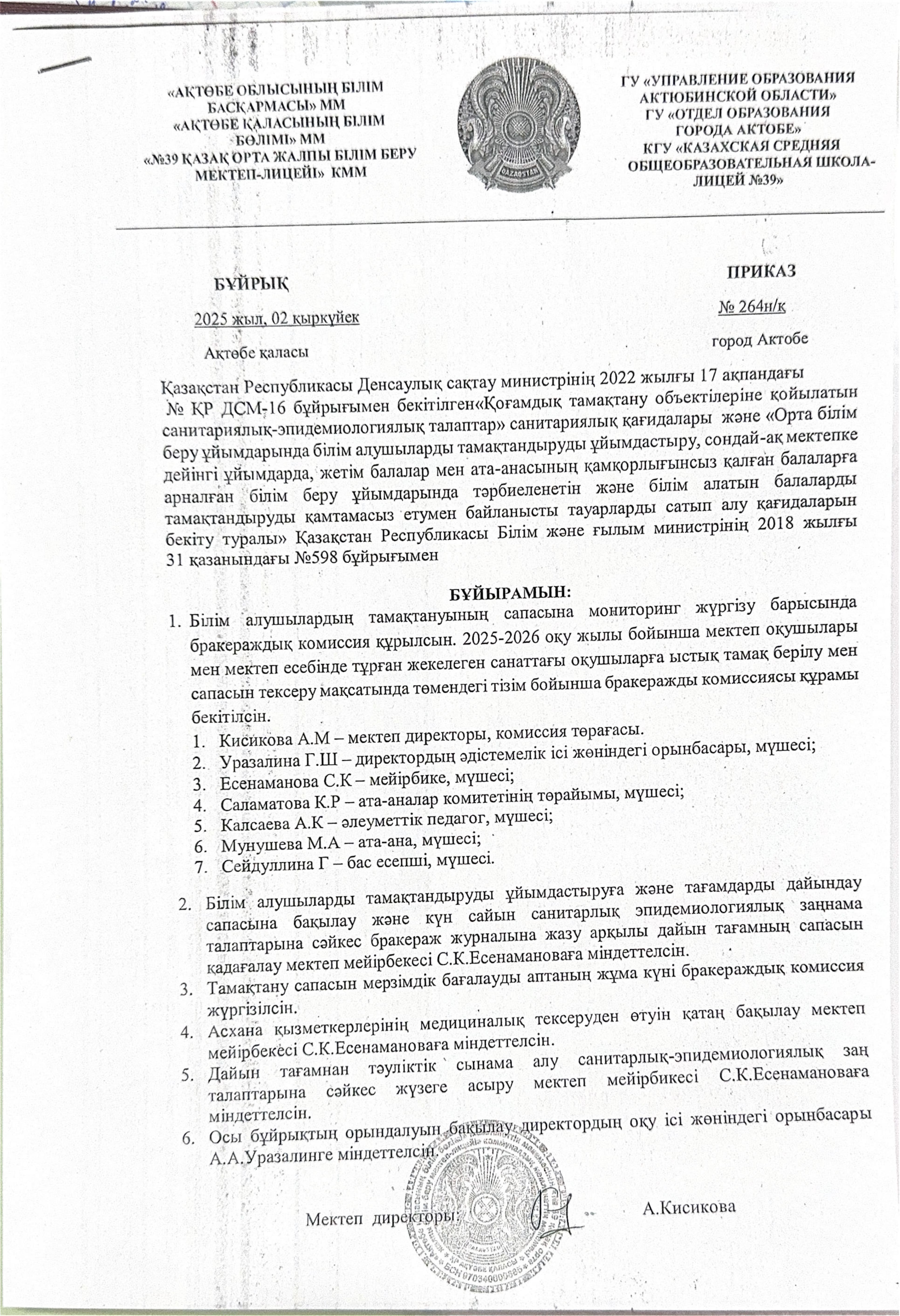 Оқушылардың тамақтануын қадағалау туралы бұйрық