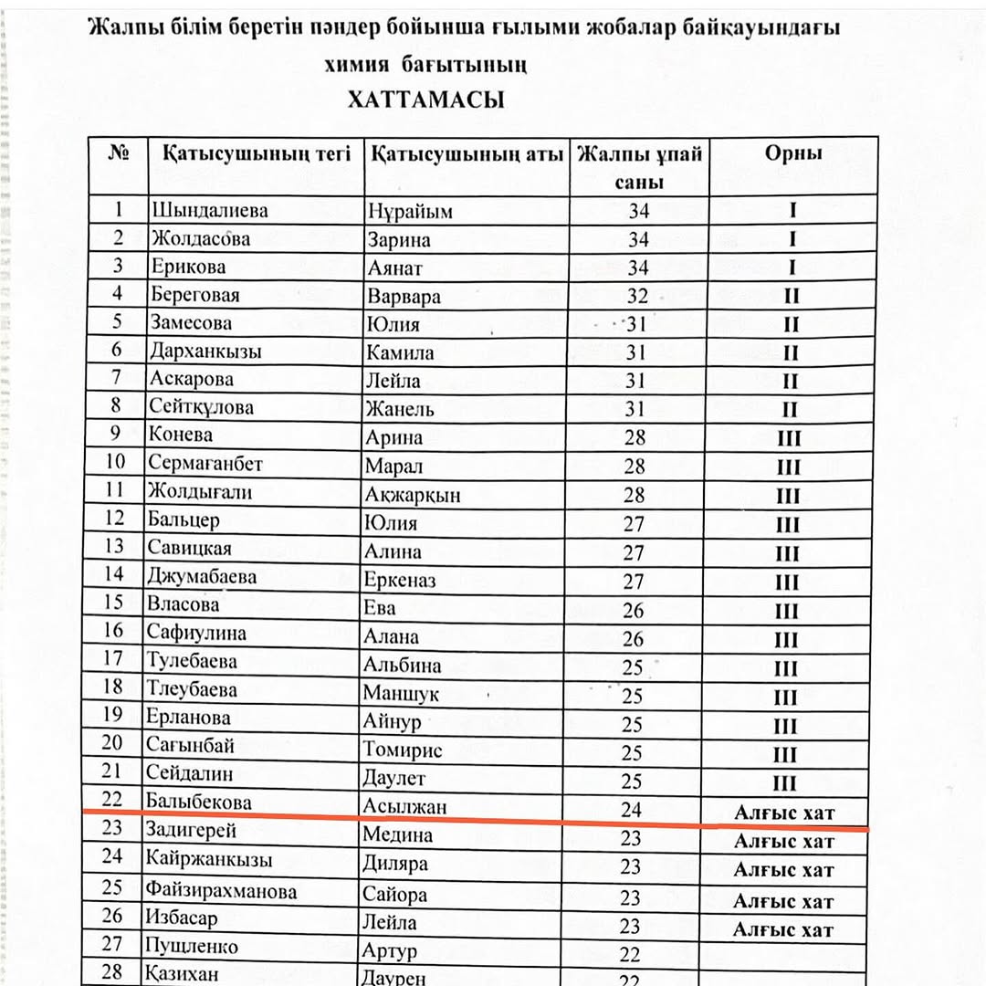 "Химия" бағытында 9 "В" сынып оқушысы Балыбекова Асылжан алғыс хатпен марапатталды.